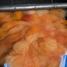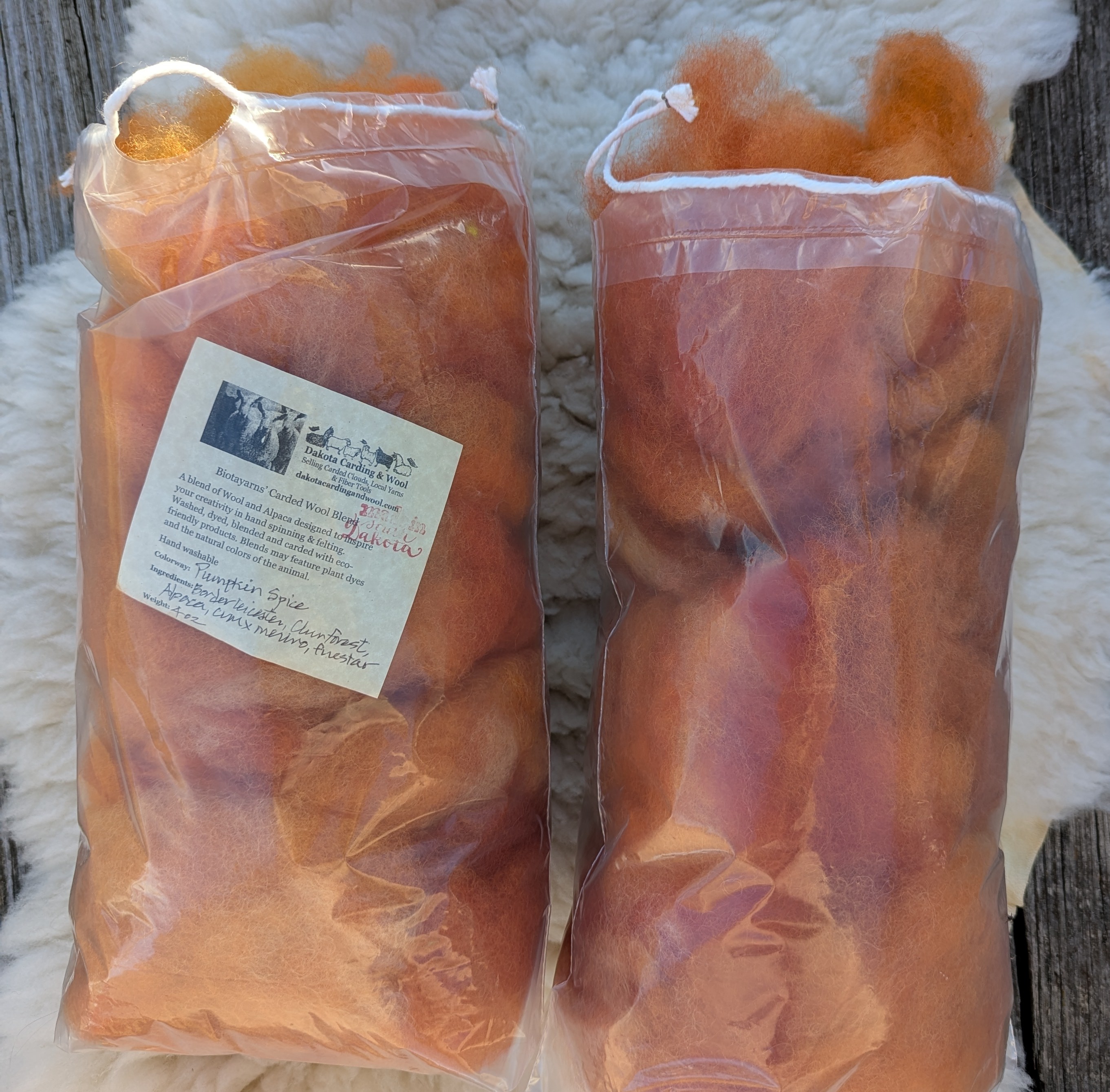 This pumpkin colored blend of Border Leicester long wool, Clun Forest Wool, Alpaca, CVM x Merino and firestar is carded into a cloud for hand spinning an artful yarn. This blend will also work well in felting projects.