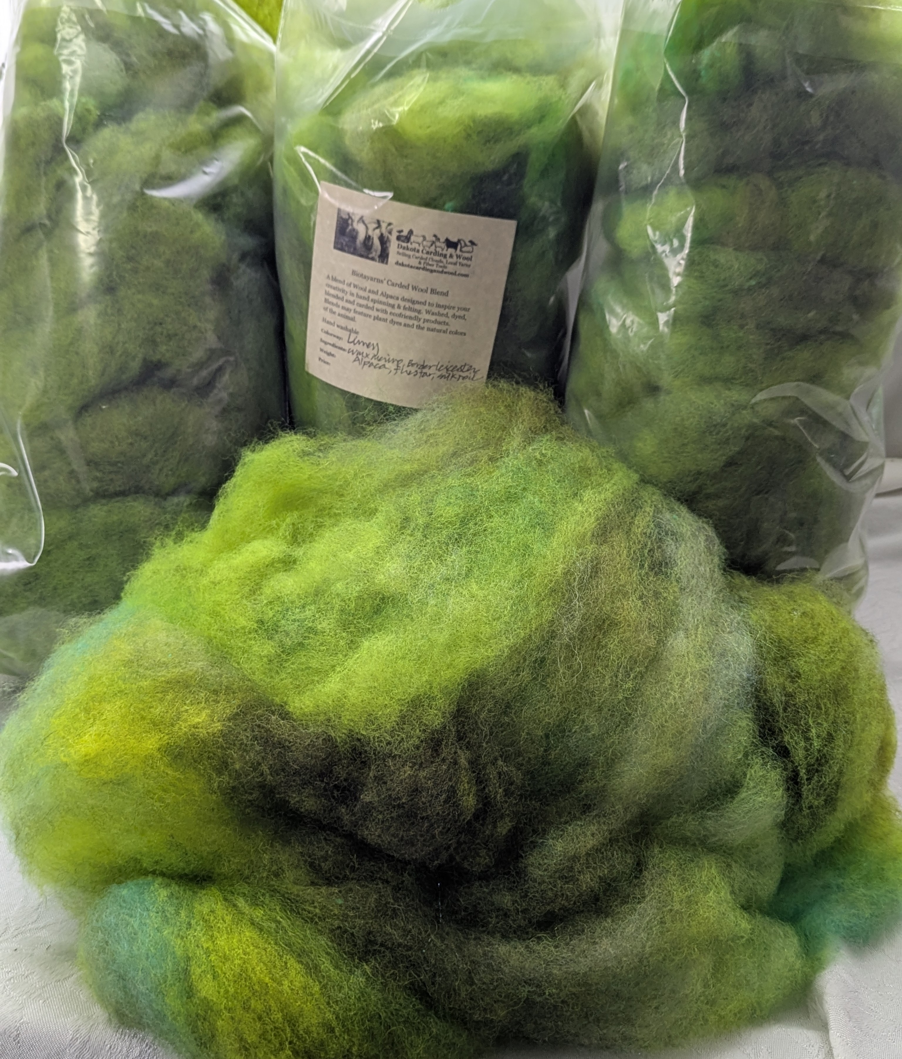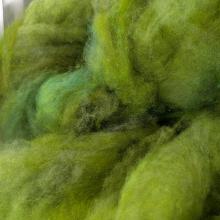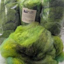Limey is a vibrant blend of flo green, dark green and mid greens all carded together but not into a homogeneous colorway, is a fully prepared cloud used by felters who are looking for a great felting wool.